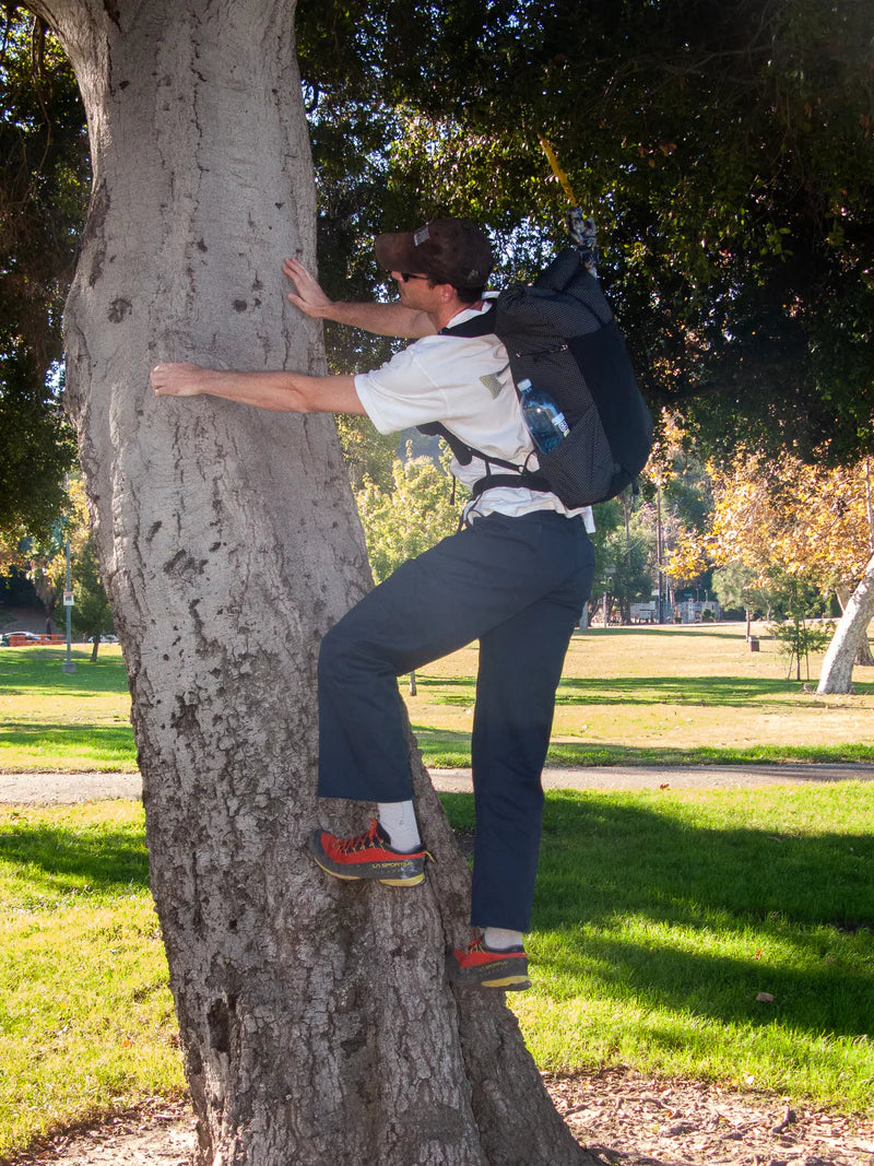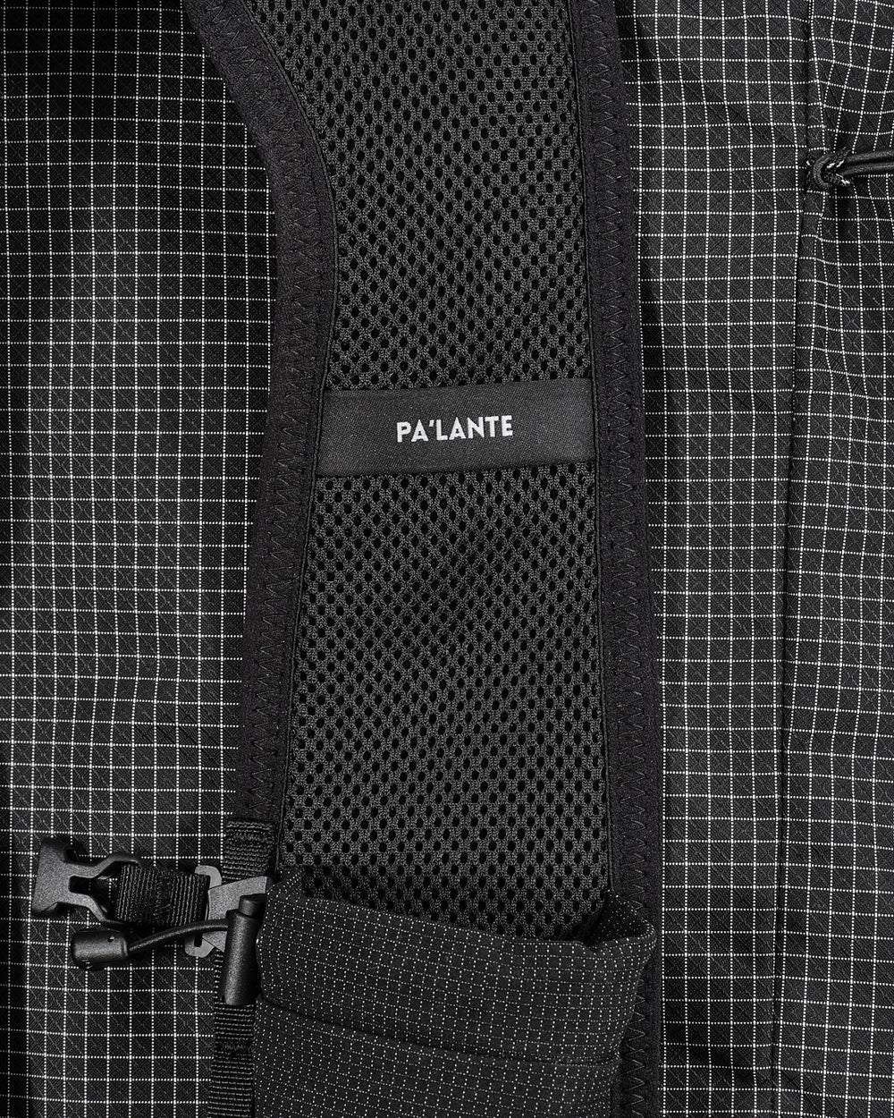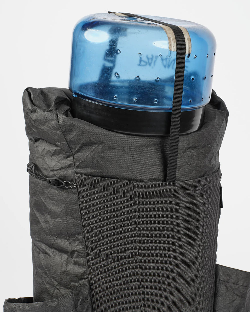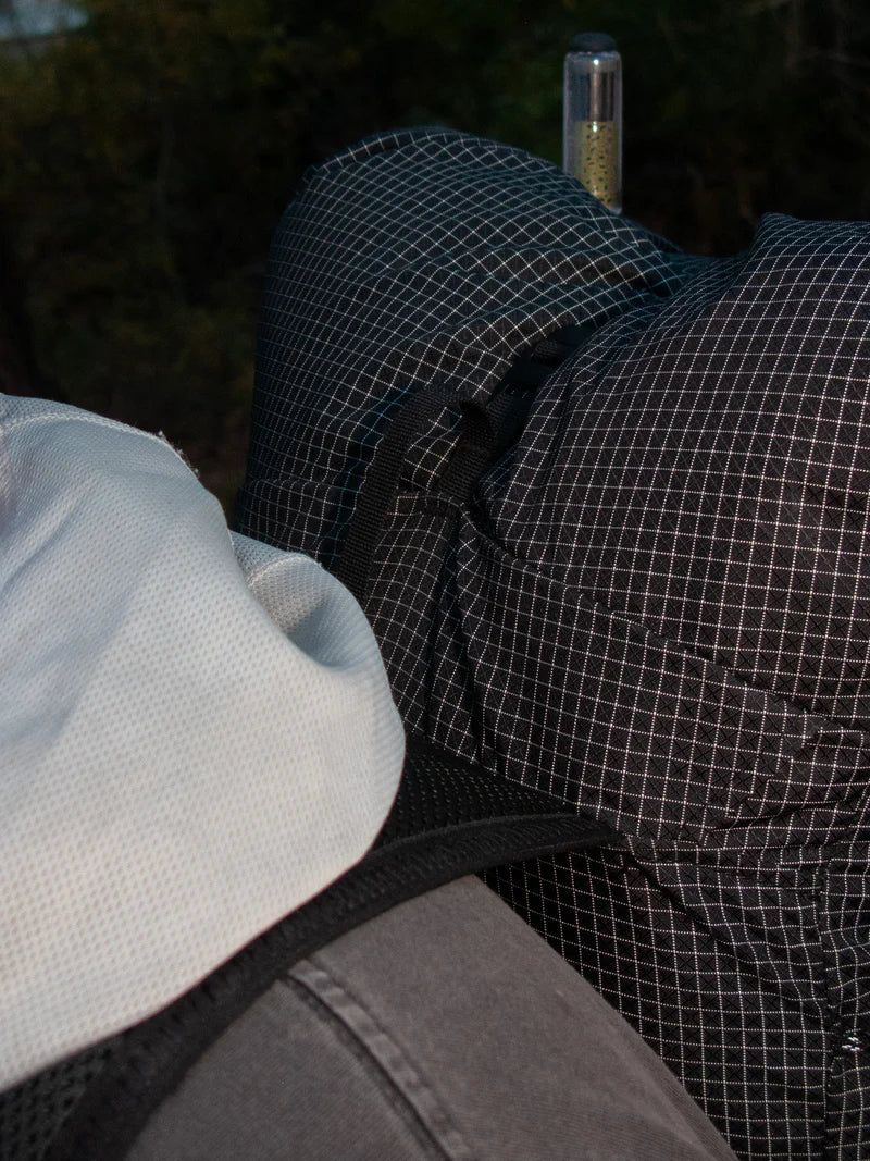 招牌底部網袋(Bottom Pocket): 這是 Pa'lante 的靈魂!使用 UHMWPE 網布,讓你在行進間不用下背包就能拿取行動糧。主開口對側還有一個小的垃圾開口(Trash portal),吃完的包裝紙直接塞進去,超方便。